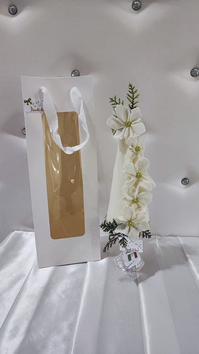 Albero di natale bianco con fiori e base in vetro.