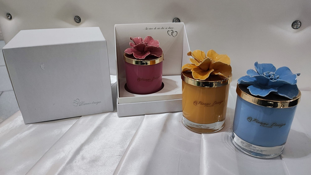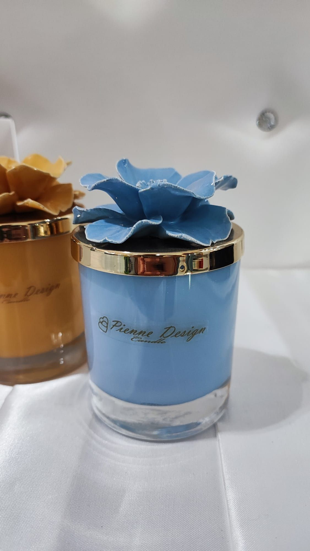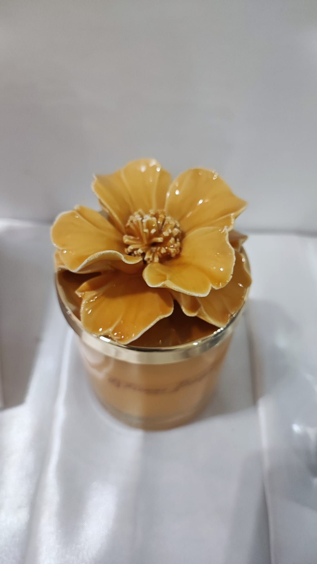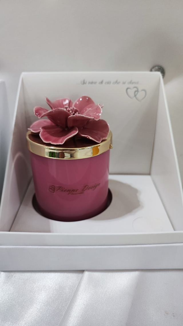 Candela con ceramica profumata e fiore in ceramica capodimonte, con colorazione effetto lucido.