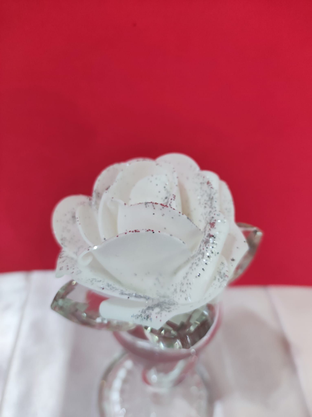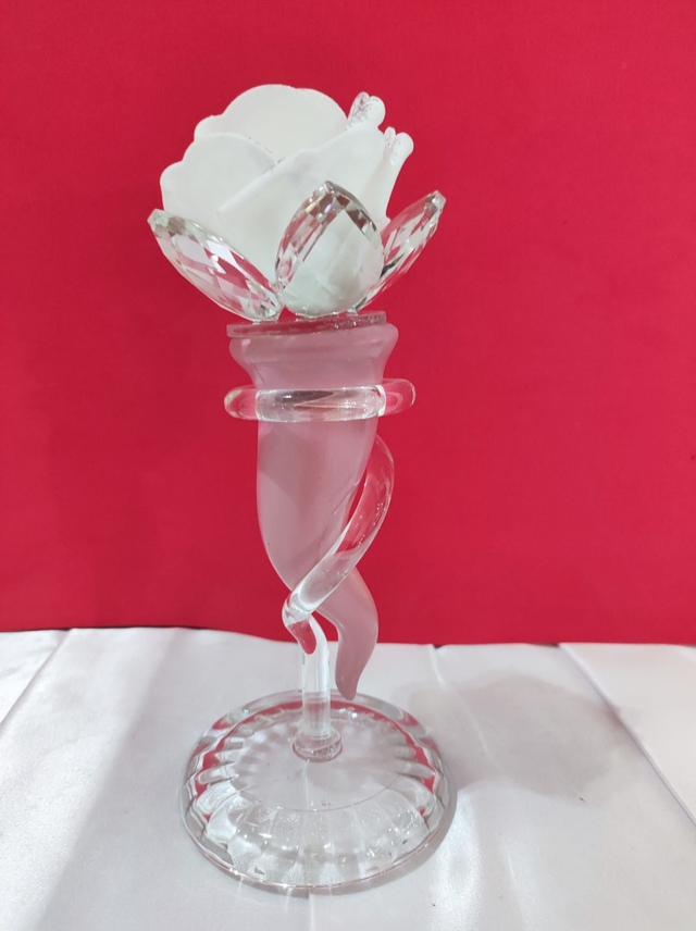 Corno in ceramica su supporto vetro con fiore in cristallo e rosa in gomma.