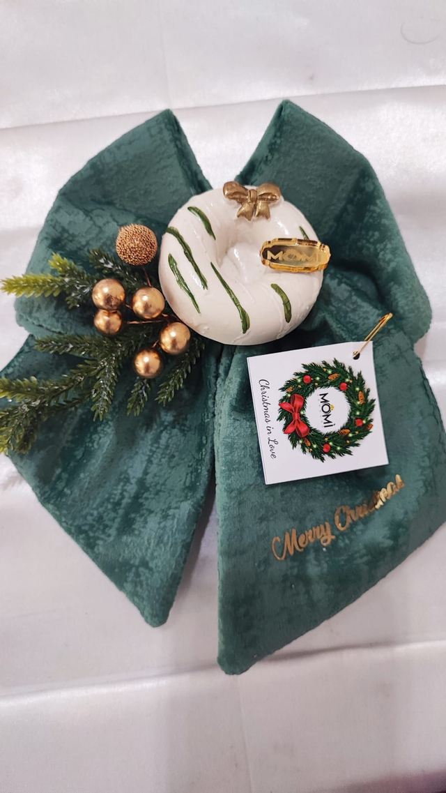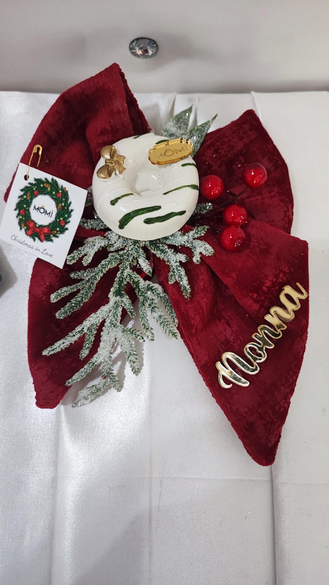 Fiocco in tessuto effetto velluto, con applicazione ciambella in ceramica.