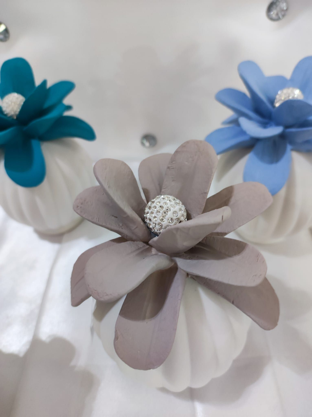 Fiore su vaso in ceramica con pallina e cristalli.