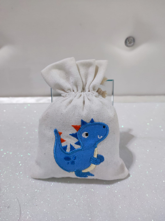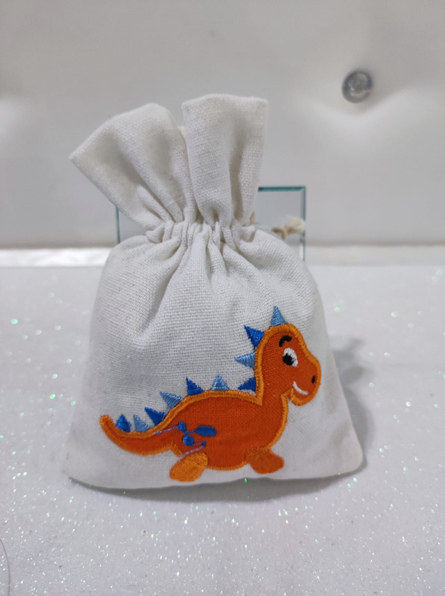 Sacchetto portaconfetti con ricamo dinosauro.
